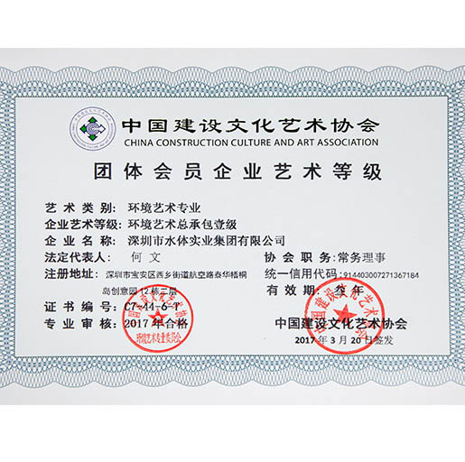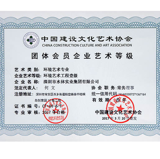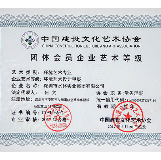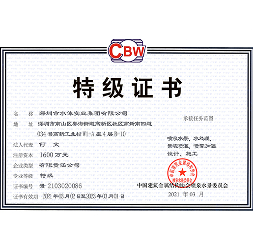 水體集團(tuán)是噴泉界的先驅(qū),是中國(guó)華南地區(qū)具實(shí)力的噴泉水景專業(yè)公司,是中國(guó)噴泉水景委員會(huì)副主任單位、中國(guó)環(huán)境藝術(shù)委員會(huì)常務(wù)理事單位、深圳市《政務(wù)、商務(wù)決策專家咨詢支持系統(tǒng)》定點(diǎn)服務(wù)單位,具備噴泉水景、水處理、景觀噴灌、噴霧加濕、設(shè)計(jì)、施工專業(yè)等級(jí),環(huán)境藝術(shù)企業(yè)藝術(shù)等級(jí)總承包類、工程類一級(jí)、設(shè)計(jì)類甲級(jí),城市及道路照明工程專業(yè)承包三級(jí),等等資質(zhì)。