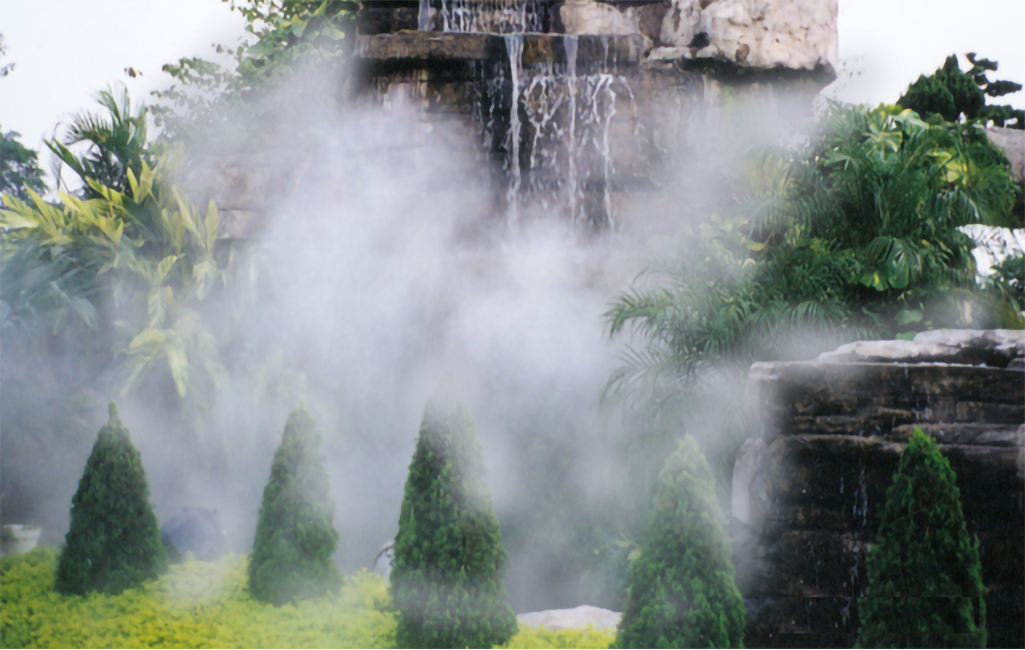 環(huán)境景觀造霧既可以美化環(huán)境、烘托氣氛,又可以提高人文及自然景觀的造景效果。極大地營(yíng)造和改進(jìn)人類生存和居住環(huán)境。它可使您如臨深山,回歸自然;如入仙境,小橋流水,綠樹(shù)紅花,云霧繚繞。此外,人造霧能產(chǎn)生大量的負(fù)離子,能有效改善人居活動(dòng)環(huán)境。